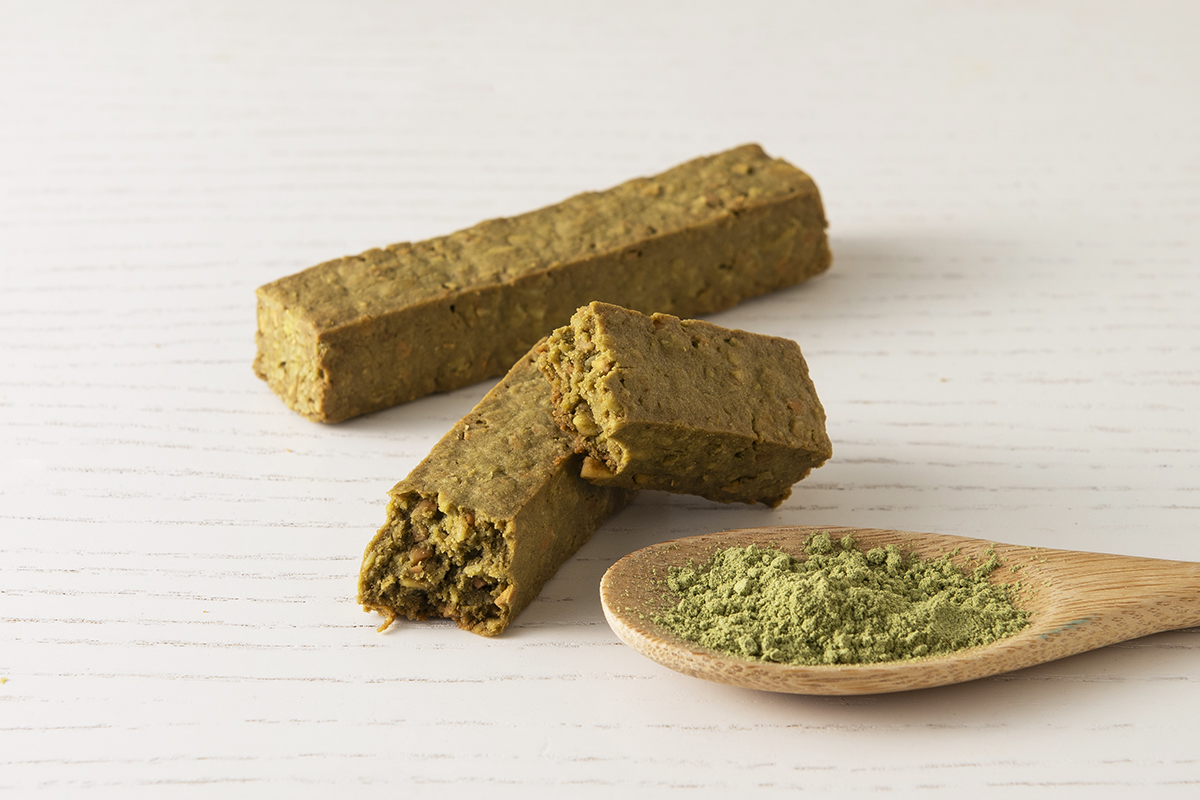 有機モリンガパウダーを使用し、ザクザクとした食感、抹茶やよもぎのような風味です。たんぱく質含有量は、1袋あたり約12.1gです。