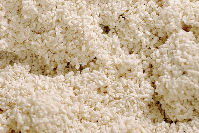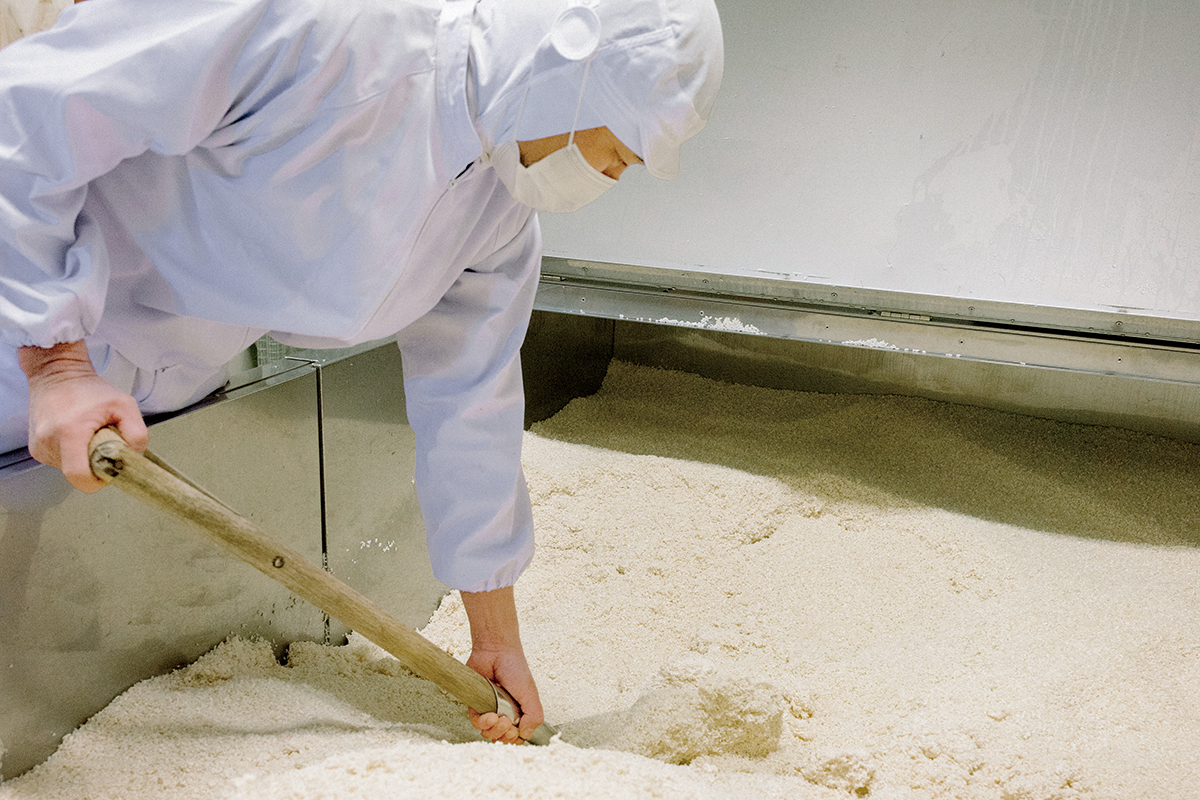米が蒸し上がったら冷却し、麹菌の種付け。麹菌は高温すぎると死滅し、低温だと成長しないため、温度管理が重要で、適温は夏なら34℃、冬は36℃程度。ここでもやはり職人の経験が必須です。