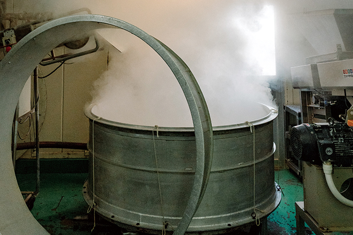 まず、ひと晩浸漬した米を大釜で蒸します。山万で採用しているのは、米が均一に蒸せる“抜け掛け製法”。また粉砕米や未熟米ではなく、良質な丸米を新鮮な状態で使うのは、そのほうが麹菌がうまくのるため。使用する米は基本的に信州産コシヒカリです。