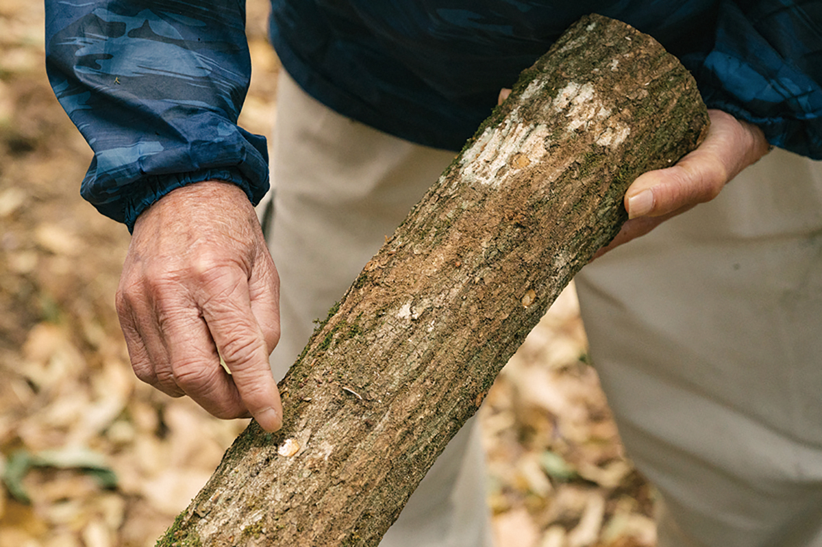 「ほだ木をひと月半くらい“仮伏せ”して、菌が活着するのを待ちます。そのあと、梅雨前ごろに“本伏せ”をします。菌がほだ木全体に蔓延して椎茸が出てくるまでは、1年半~2年くらいかな」