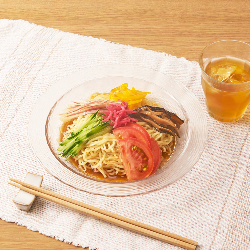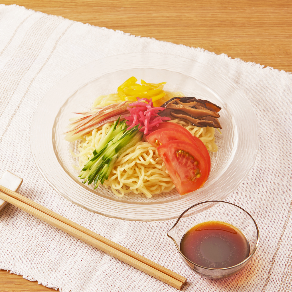 ③麺を皿に盛り、添付の醤油だれをかけてください。(お好みの具材を添えれば一層美味しく召し上がれます。)