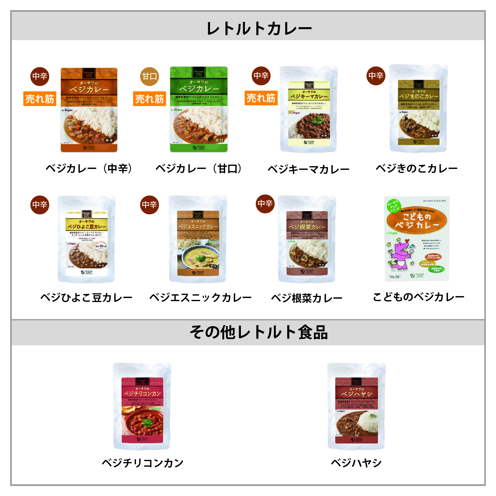 - 金時豆(国産)、ひよこ豆(アメリカ、カナダ、トルコ、他)、ローストオニオン[玉ねぎ(国産)]、粒状大豆たんぱく[大豆(国産)]、にんじん(国産)、有機トマトペースト[有機トマト(アメリカ)]、赤ワイン、なたね油、酵母エキス、有機アガベシロップ、おろしにんにく[にんにく(国産)]、食塩(海の精)、香辛料、シーズニング、馬鈴薯でん粉、オーサワの野菜ブイヨン