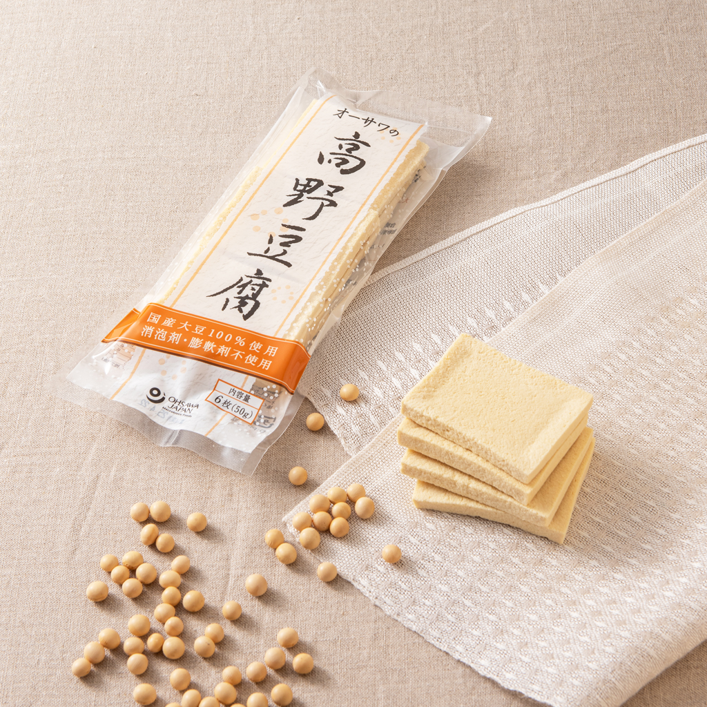 「オーサワの高野豆腐」は国産大豆100%使用、消泡剤・膨軟剤不使用、生の大豆から豆乳を搾った「生搾り製法」で大豆本来の風味がいきています。煮物はもちろん、炒め物や揚げ物にも幅広く使え、植物性食品だけでも満足感のある一皿に仕上がります。