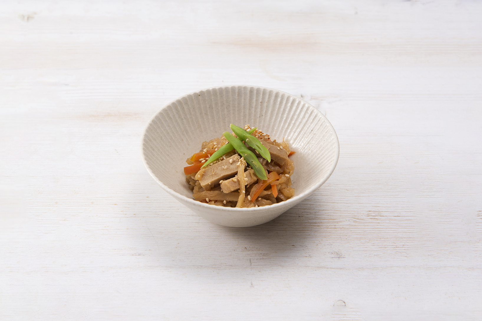 ・高野豆腐は熱湯に5~6分浸してやわらかくもどし、冷めたら軽く絞る。1.もどした高野豆腐は薄切りにする。 にんじんは細切り、切干大根はさっと水洗いしてザルにあげて水気をきっておく。