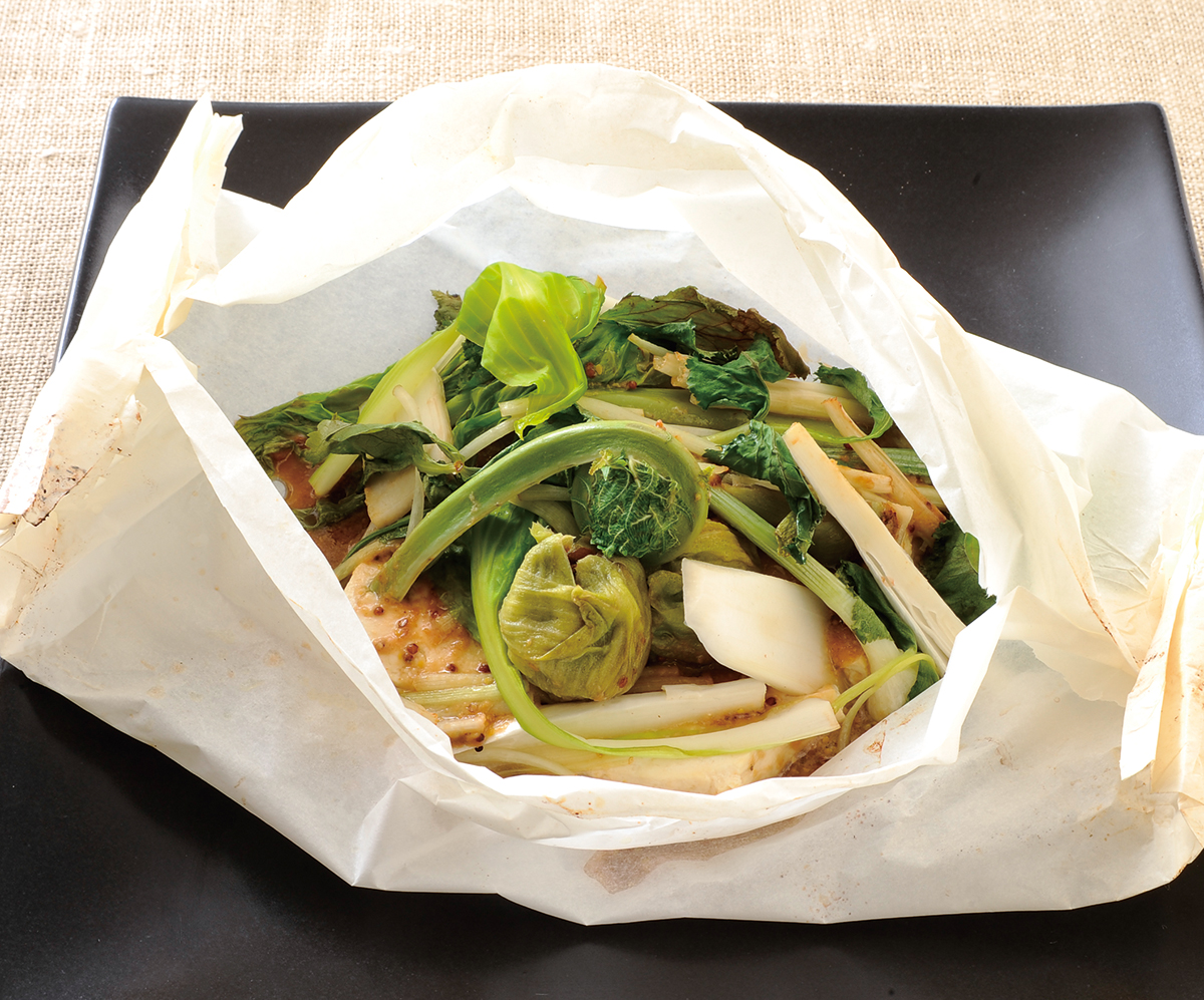2.クッキングシートを広げ、中央部に味噌マスタードソースを薄く伸ばして塗る。その上に豆腐を2枚敷き、さらにソースをかける。山うど、根三つ葉、山菜を混ぜて豆腐の上に乗せ、スプーンでソースを散らす。クッキングシートの合わせ目を折って包み込み、両端を返し折る。