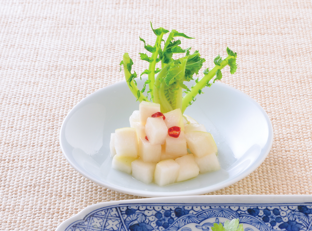 1.大根は1.5cm角のさいの目に切る。薄く塩をしてしばらく置き、水気を拭き取る。