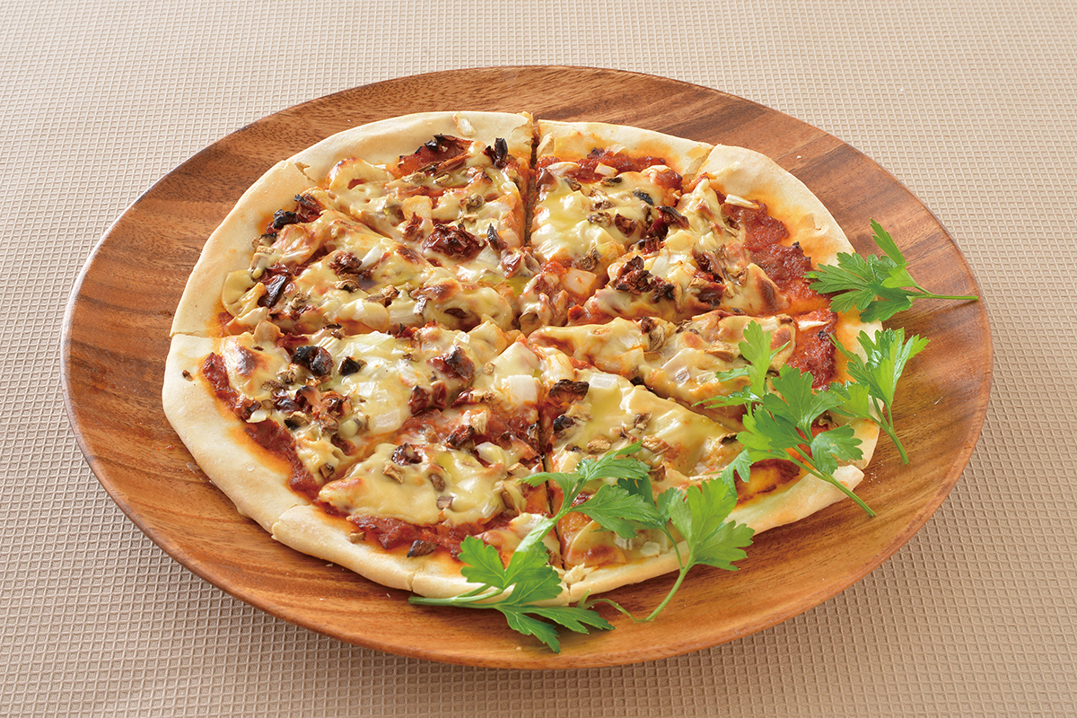 5.トッピングのドライトマトは少量の湯に漬けて柔らかくし、玉ねぎ、マッシュルームとともに5mm角に刻む。4にトマト味噌の1/4量を塗り広げ、その上にべジ・チーズの1/8量をかける。玉ねぎ、マッシュルーム、ドライトマトをのせて、再度べジ・チーズ1/8量をかける。