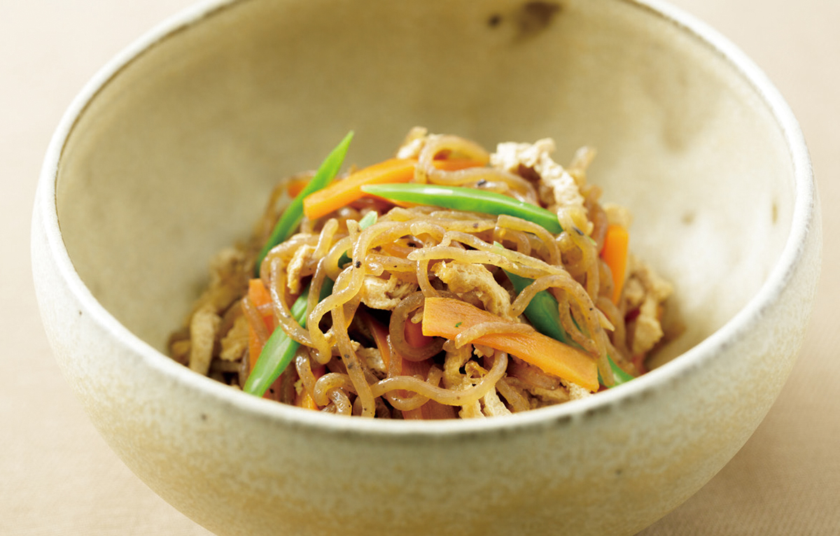 1.しらたきは塩で軽く揉んでから水洗いし、たっぷりのお湯で3~4分茹でザルに上げ、水分を切り、3~4cmの長さに切り揃える。