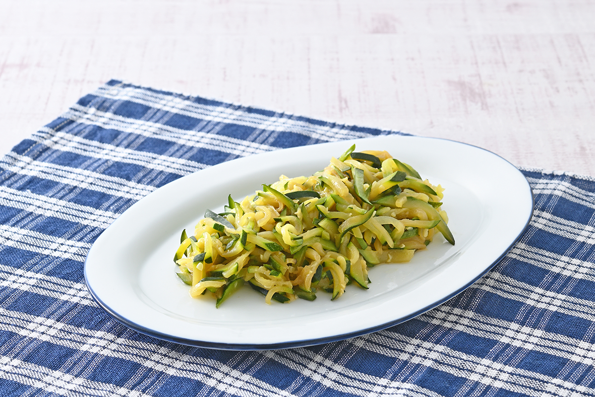 2.鍋を温め、油をひき、ズッキーニを入れる。ズッキーニの匂いと色が変わるまで炒める。