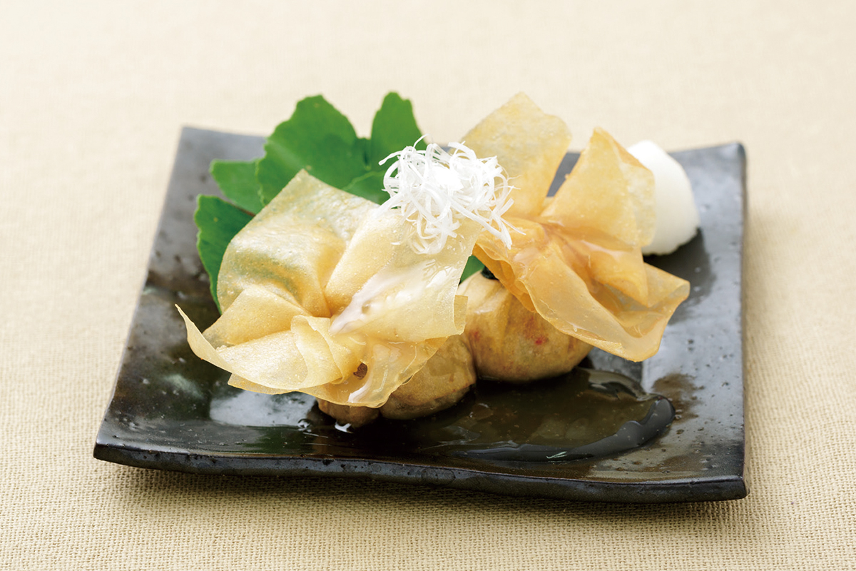 4.1~3を合わせて塩と醤油で下味を付け、春巻きの皮で包んで油で揚げる。