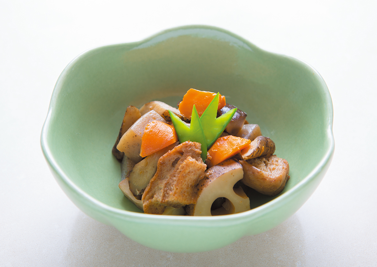 3.蓮根、こんにゃく、ごぼう、椎茸は鍋の下に並べ、車麩、人参は上に並べてだし汁を張って煮る。