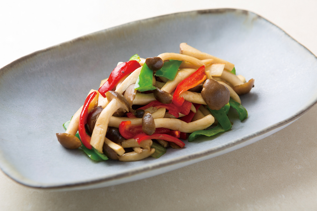 1.エリンギ、ピーマン、しめじはそれぞれ3~4cmの細切りにして油で炒め、醤油味で仕上げる。