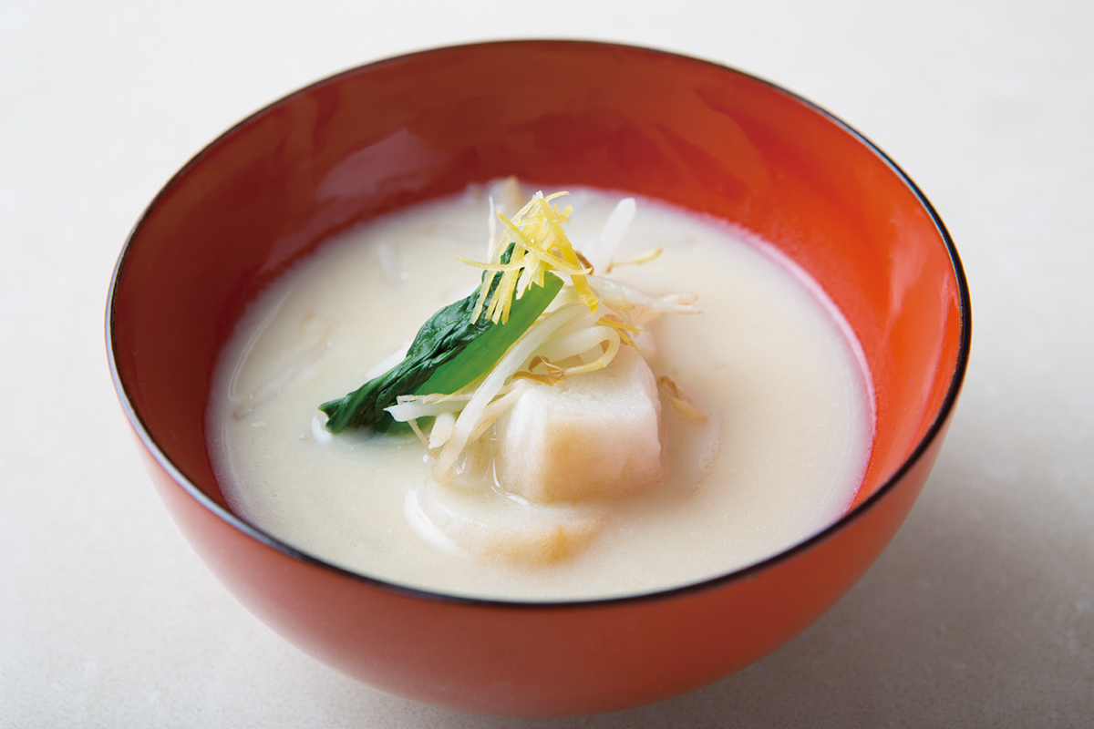 3.だし汁を塩、醤油で調味し、最後に豆乳を入れて仕上げる。