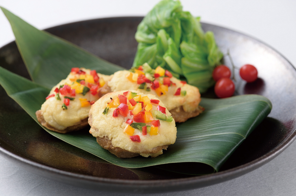 3.豆腐と大和芋を混ぜ合わせ塩、醤油で味付けをして1にのせ、その上にパプリカとピーマンをのせてオーブンで焼く。