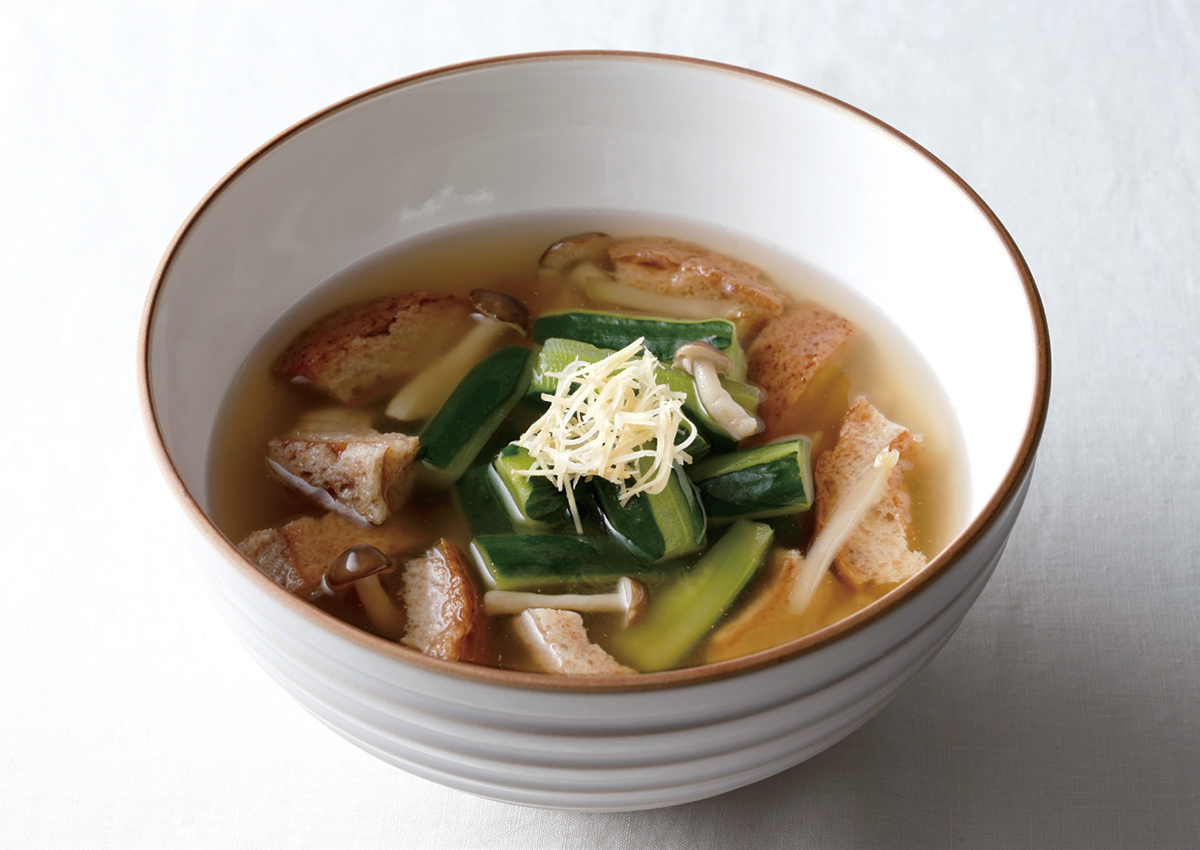 4.鍋にだし汁を煮立て1を入れ、きゅうりと搾菜を加え、塩と醤油で調味し胡麻油を落として針生姜を飾る。