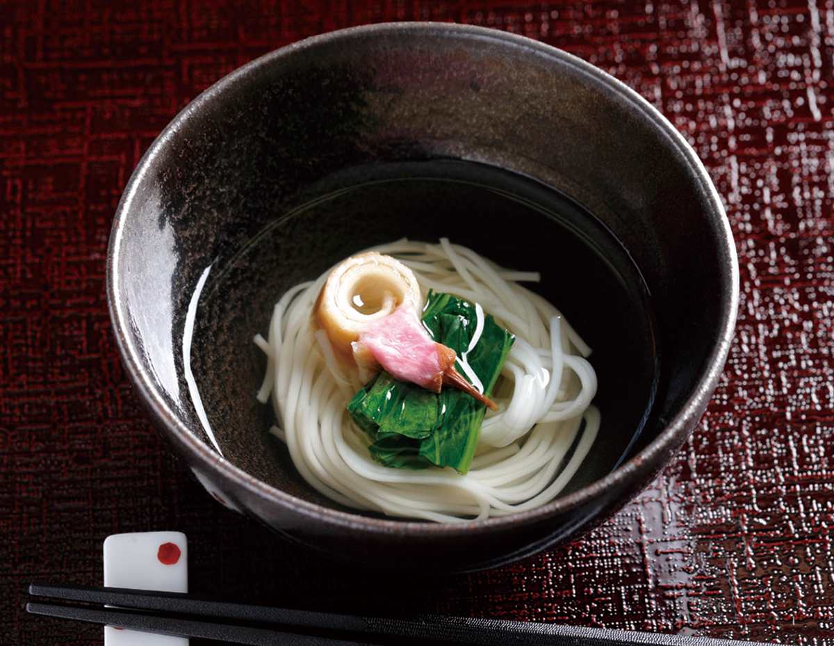 3.1に麩と青葉を入れ、だし汁をはり、桜の花を飾る。