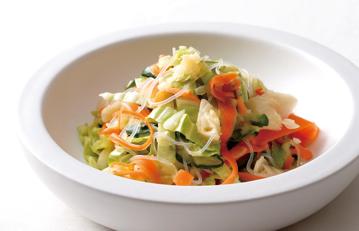 1.人参と大根は皮むき器でテープ状に切り、キャベツは太めの千切りにしてそれぞれ塩でもんでおく。