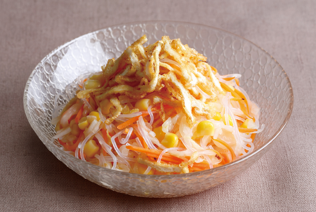 4.人参ととうもろこし、1を混ぜ、3を和えて2を散らす。