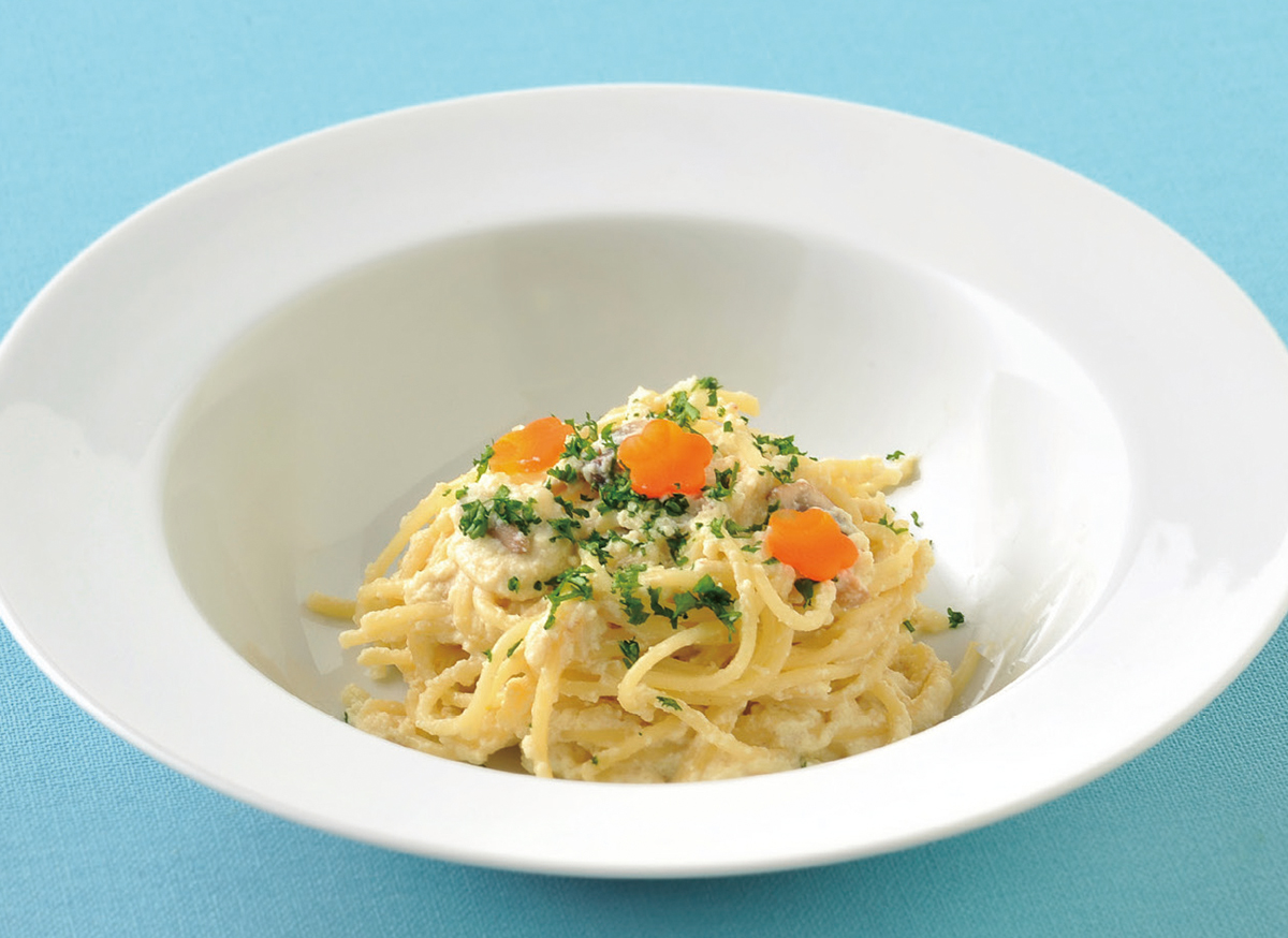 4.いただく直前に3を2の鍋に入れ、トングでよく混ぜ、豆腐クリームをパスタに絡ませる。